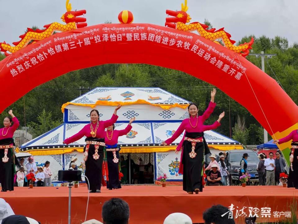 作为一项举办三十届的品牌活动,“拉泽恰日” 早已超越普通体育赛事的范畴,成为恰卜恰镇各族群众的 “团结约定”。开幕式上,共和县文化馆的演员们身着藏、汉、回、蒙古等民族服饰,献上《美丽共和》《各民族心连心》等特色节目,悠扬的则柔与欢快的汉舞蹈交织,赢得在场百余名群众阵阵喝彩。周边乡村的农牧民扶老携幼赶来,搭起帐篷谈笑风生,共同感受浓厚的团结氛围。